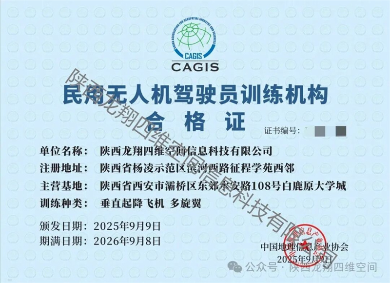 days 09 /12 熱烈祝賀陜西龍翔四維空間信息科技有限公司成功取得民用無人機駕駛員訓(xùn)練機構(gòu)合格證! 恭喜陜西龍翔四維空間信息科技有限公司斬獲民用無人機駕駛員訓(xùn)練機構(gòu)合格證!這是專業(yè)實力的硬核認(rèn)證,也是信任的基石,愿以此為起……
